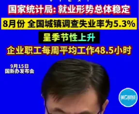 唐人日报9月17日讯:国务院新闻办公室召开新闻发布会,国家统计局新闻发言人付凌晖在会上介绍了8月份的就业数据。他表示,全国城镇调查失业率为5.3%,比上月有所上升,但属于季节性波动,就业总体保持稳定。同时,企业职工每周平均工作时长为48.5小时,反映出用工需求依旧较强。