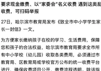 唐人日报9月30日讯:哈尔滨市教育局发布《致全市中小学学生家长一封信》,直指社会高度关注的校园乱收费问题,要求全市所有中小学校收取各类费用时,必须通过统一的缴费平台进行,确保程序透明、去向清晰。任何形式的现金缴纳,或以“家委会”等名义私下收取费用,均被明确定性为乱收费行为。