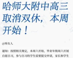 唐人日报9月9日讯:近日,哈尔滨师范大学附属中学发布通知,自本周起,高三年级将取消双休日,改为所谓“自愿自习”。按照校方要求,学生与家长必须共同签署申请书,方能进入校内参与学习。这一举措在网络上引发热议,不少家长和教育人士直言,这是“变相加课”,更是将学生和家长置于“被自愿”的境地。