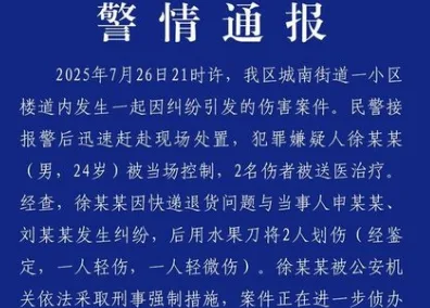 唐人日报8月4日讯:浙江嘉兴经开区公安分局发布通报称,近日城南街道某小区楼道内发生一起因纠纷引发的伤害案件,事件经过与处理结果迅速引发社会关注。