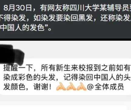 唐人日报9月1日讯:一则四川大学辅导员在群内发布的通知引发热议。通知明确要求即将入学的新生在报到前“不得染彩色头发”,若已染发,必须在开学前“染回黑色”。更具争议的是,该辅导员还强调:“染发后的颜色不是中国人的发色。”