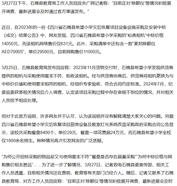 唐人日报3月29日讯:近日,一份希望小学灾后重建项目的中标公告在社交媒体上引起了广泛的关注和质疑。公告显示,涉事学校在采购过程中存在一些疑点,包括单反相机、除颤仪及餐盘的采购价格与市场价差异巨大,引发了公众的热议。