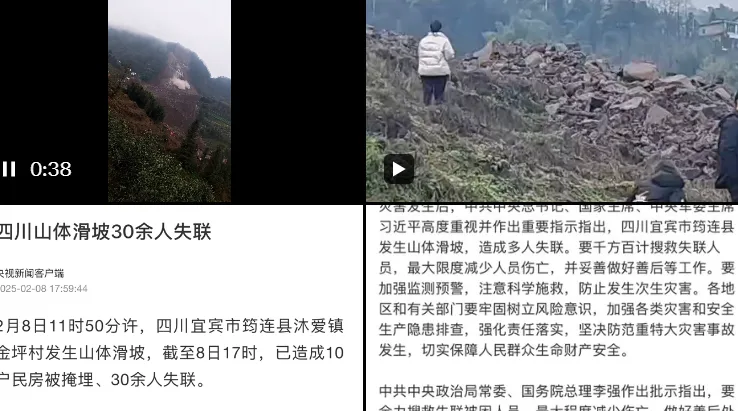 唐人日报2月9日讯:近日,四川宜宾市筠连县金坪村发生山体滑坡。截至17时,已造成10户民房被掩埋,约30人失联。灾后救援工作紧急展开,现场挖掘工作持续进行。