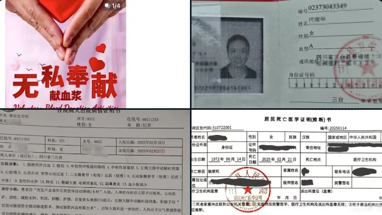 唐人日报2月27日讯:近日,四川绵阳三台县发生一起悲剧,52岁妇女在献血后死亡。死亡证明显示其死因是脑梗死。死者家属陈女士表示,18日母亲听到村里大喇叭宣传“免费体检”后,与姑姑一同前往体检,之后被带到血浆站进行献血。家属怀疑血浆站利用免费体检为诱饵,吸引农村老人献血。