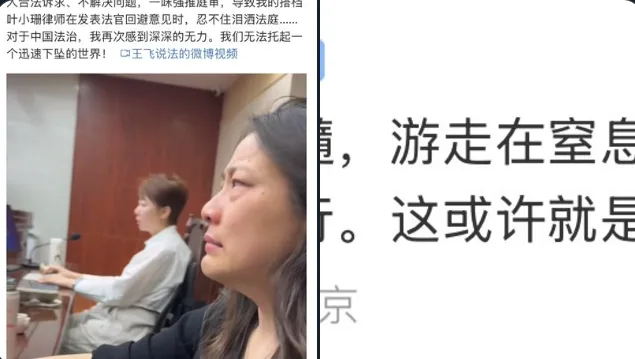 王飞透露,当日其搭档叶小珊律师在法庭上提出法官回避申请,因情绪激动与长期积压的无力感,在发言过程中泪洒法庭,引发在场人员震动。他痛心地写道:“对于中国法治,我再次感到深深的无力。我们无法托起一个迅速下坠的世界。”