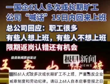 唐人日报7月21日讯:近日,国企上市公司甘肃能化旗下子公司——甘肃靖煤能源发布通报,称共有61名员工存在多次或长期旷工行为。令人震惊的是,公司并未直接处理,而是给予“限期返岗、主动认错”的机会,要求相关人员在15日内复工,否则将依法处理。