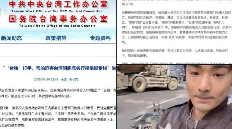 唐人日报3月28日讯:国台办日前推出的“‘台独’打手、帮凶迫害台湾同胞恶劣行径举报专栏”自启动以来备受关注,并引发举报热潮。根据中国官方媒体的报道,该举报专栏首批公布了11名涉嫌“台独”行为的个体,其中包括知名度较高的台湾网红温子渝(绰号“八炯”)和陈柏源(绰号“闽南狼”),以及被标记为“台独顽固分子”的沈伯洋和曹兴诚。