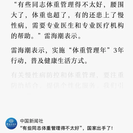 雷海潮强调,过重及相关慢性疾病的增多已成为国家关注的重大公共健康问题。他提到,体重管理不佳和相关健康问题的普遍存在,需要通过专业医生和医疗机构的帮助来解决。他鼓励有此类健康问题的政府工作人员积极寻求医疗帮助,并建议政府部门应增强健康管理意识,为员工提供更多的健康指导和支持。