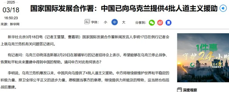 国家国际发展合作署:中国共向乌提供4批人道主义援助