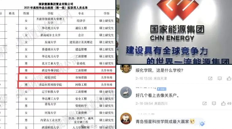 唐人日报2月23日讯:近日,国家能源集团置业有限公司发布的一份高校毕业生拟录用名单引发广泛关注。该名单中16名毕业生中,13名为国内外知名院校的硕士研究生,3名本科生则来自较为普通的院校。此举引发网友质疑,认为其中存在“关系户”或“萝卜岗”的嫌疑。