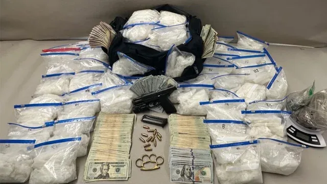 警方随即对车辆进行搜查,发现多项可疑物品,包括被盗的残疾人停车标志、信用卡、文件,以及少量非法毒品。随后,执法人员又对两人关联的酒店房间进行搜索,查获62磅甲基苯丙胺(俗称冰毒)、2磅海洛因,以及毒品交易所用的包装材料和设备。