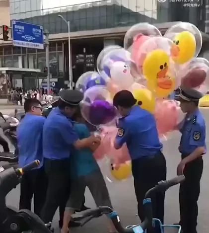 据目击者拍摄的视频显示,这名小贩死死抓着自己的气球不撒手,试图保护自己的生计。然而,面对人数众多的城管队伍,小贩最终无力回天,只能眼睁睁看着气球被城管强行放飞。事发地点周围聚集了众多路人,他们通过手机记录下了这一过程。