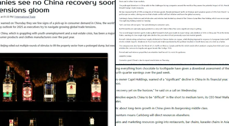 唐人日报2月9日讯:近日,法国烈酒生产商保乐力加和丹麦啤酒巨头嘉士伯表示,几乎没有看到中国消费者需求回升的迹象,预示着中国经济短期内难以复苏。