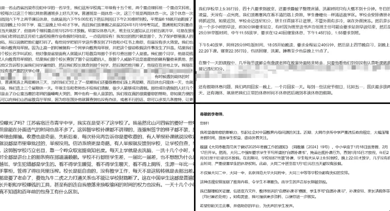 唐人日报2月2日讯:近日,来自河南焦作温县一中、山西吕梁汾阳中学、江苏宿迁青华中学及山西大同市部分高中的学生向社会反映,面对巨大的学业压力与不合理的作息时间,他们的境遇引发关注。学生们称,平时一周甚至两周才有一次休息,早上6点18分便开始跑操,晚上最晚10点40才放学。寒假期间,放假仅有6天,初五晚上便需返校。
