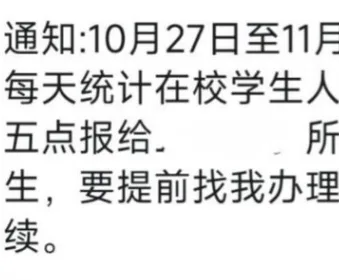 据悉,通知未说明此轮“集中统计”的具体原因。有传言称与近期个别学生“擅自离校”或校园安全检查有关,但校方未作回应。一名辅导员在班级群中提醒学生,“这是上级督查要求,全校统一执行,不能掉队。”