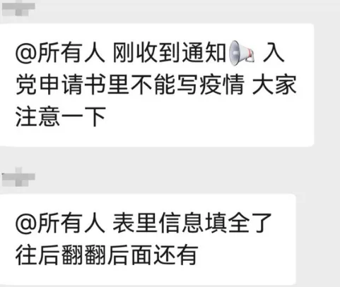 唐人日报11月7日讯:近日,大连一所高校被曝要求有意入党的学生在申请书中不得提及“疫情”相关内容,引发校内外热议。多名学生称,学院在内部通知中明确指出:“入党申请书不得出现‘疫情’、‘封控’、‘志愿抗疫’等字样,否则退回重写。”