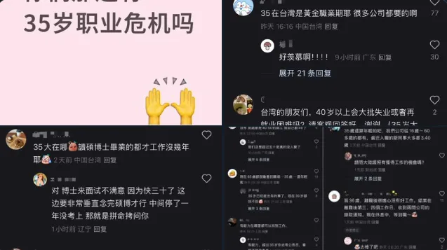 多位台湾网友表示,35岁在台湾职场中并非“危机”,反而正值“黄金时期”。有网友写道:“35岁在台湾是黄金职业期,很多公司都要的啊。”还有人直言:“我35岁找工作去哪家公司都要我,台湾缺工。”另一位则质疑大陆对年龄的焦虑文化:“35岁还很年轻,为什么是大龄?”