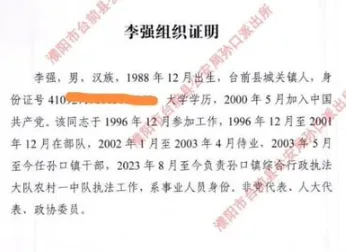 唐人日报9月1日讯:近日,一份来自河南省濮阳市台前县孙口镇党委的组织证明引发舆论哗然。证明内容显示,该镇一名现任综合行政执法大队农村一中队执法人员,竟在8岁时就进入部队“参加工作”,12岁便火速“入党”。这一明显违反常识与规定的经历,被不少网友讥讽为“神童简历”“天才少年”,更让公众质疑当地基层用人和审核机制的严肃性。