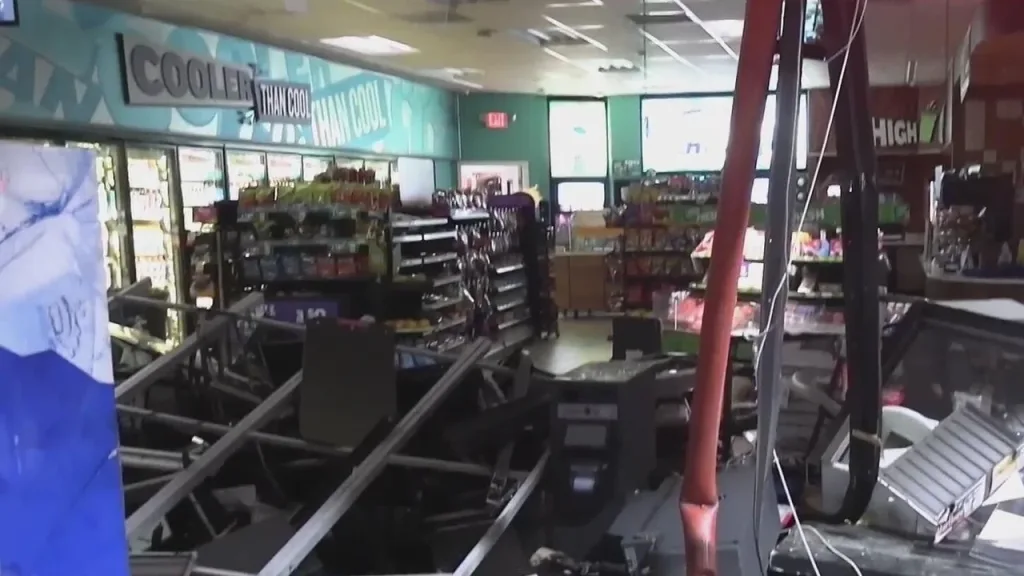 第一起事件发生在凌晨2点前,一辆黑色SUV猛然冲入位于Hegenberger路、靠近880号州际公路和奥克兰体育馆附近的一家Ampm便利店。店员对CBS新闻表示,当时店内突然传来巨响,随后在店中发现整辆车卡在货架之间,现场一片狼藉。