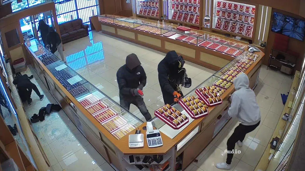 案件发生于7月6日下午1点15分左右,地点位于斯托克顿大道与奥兰治大道交界处。一伙至少九人的团伙分乘两车抵达现场,其中一人对店内保安喷射胡椒喷雾,另有两名嫌犯持钝器砸碎玻璃陈列柜,迅速抢走大量贵重首饰。