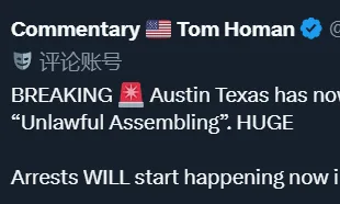 霍曼指出,抗议规模“巨大”,当局正准备采取强制措施恢复秩序。他写道:“德克萨斯州即将开始逮捕行动。”此前奥斯汀市中心已出现多次阻断交通、对执法人员挑衅等混乱场面。