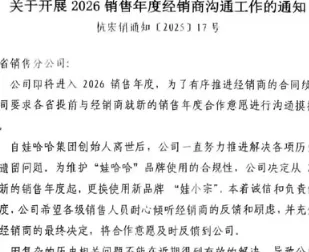 唐人日报9月18日讯:近日,一份题为《关于开展2026销售年度经销商沟通工作的通知》的内部文件在网络流传,引发各界关注。文件显示,出于对“娃哈哈”品牌合规性维护的考虑,公司计划自2026年销售年度起启用新品牌“娃小宗”,以替代长期沿用的“娃哈哈”名称。这一消息迅速登上舆论焦点,在消费者与经销商群体中掀起激烈讨论。