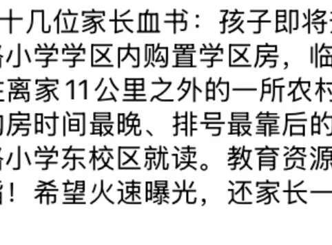 家长们表示,他们此前在凤凰路小学学区范围内购房,原本期待子女能顺利进入这所学校。然而在新学期临近之际,学校却以“名额紧张”为由拒绝接收部分孩子。更让人无法接受的是,部分家庭明明排名靠后,却通过所谓“关系”顺利进入凤凰路小学,而真正按规在学区购房的孩子,却被拒之门外,被迫到远郊农村学校就读。