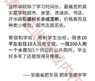 “我们那时每天从早上6点到晚上10点半都在学习,除了睡觉没有自由时间。可比学习更让人记恨的,是那种被压榨的生活。”发帖者感叹,“毕业好多年了,想起来还恨得牙痒痒。”