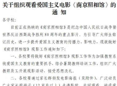 再看影片本身,《南京照相馆》作为红色题材影片,本无可厚非。但若以硬性指标推动“全员到场”,并将观影作为“爱国教育的重要抓手”,容易陷入“看过就是学过”“打卡即完成任务”的误区。对学生而言,真正的历史理解与价值观塑造,需要结合讨论、分析与多元化的学习方式,而不是单一的被动观影。