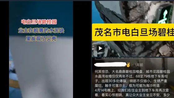 唐人日报4月24日讯:近日,广东茂名碧桂园城市花园小区爆出“海沙建楼”疑云。一段曝光视频引发热议,画面中地下车库的承重柱不仅钢筋锈蚀断裂,混凝土更是“一敲就碎”,更令人震惊的是,柱子内部竟发现贝壳残片,疑似使用了未经处理的海沙。