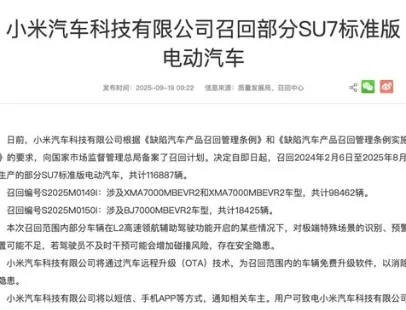 唐人日报9月22日讯:小米汽车科技有限公司发布召回公告,决定自即日起召回共计116,887辆SU7标准版电动汽车。此次召回原因直指车辆搭载的L2高速领航辅助驾驶系统在极端特殊场景下存在识别与处置不足的问题,若驾驶员未能及时干预,极有可能增加碰撞风险,构成严重安全隐患。
