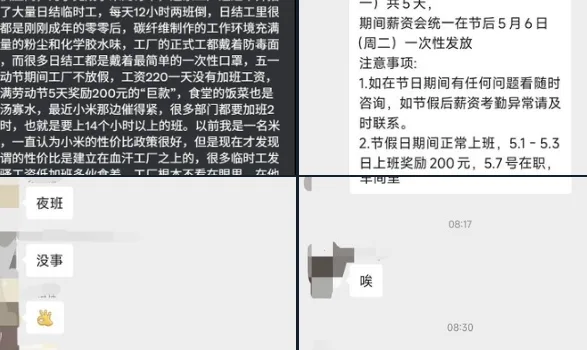 投稿人透露,碳纤维生产线粉尘密布,弥漫着强烈的化学胶水味。正式工配备防毒面具,而大多数日结工仅戴一次性口罩,几乎毫无防护。五一劳动节期间,工人需连续工作5天,仅被承诺额外补贴200元,日薪220元不涨不变。饭菜清淡、加班超时现象严重,部分工人每天甚至要干14小时。