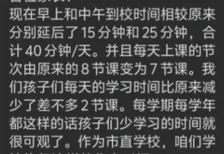 唐人日报4月22日讯:近日,一则来自某市直学校家委会的倡议书引发关注。倡议书指出,由于学校调整作息时间,学生每日早上和中午到校时间较原来分别延后了15分钟和25分钟,合计每天减少学习时间约40分钟,加之课程总节数由原来的8节缩减为7节,学生整体学习时间明显缩水。