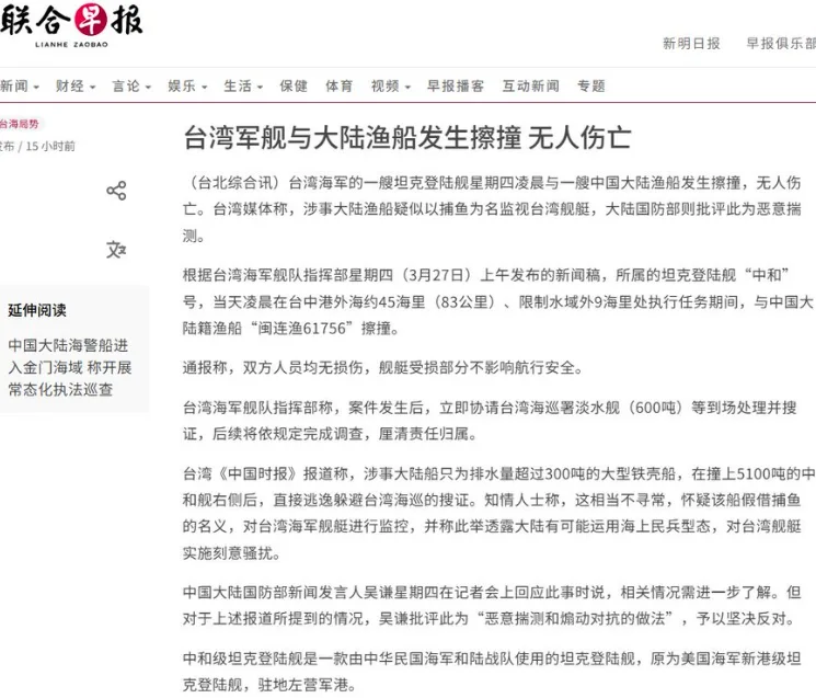 唐人日报3月29日讯:近日,在台湾海域发生了一起重大舰船碰撞事件,台湾海军的中和号坦克登陆舰与一艘排水量超过300吨的中国渔船发生擦撞,所幸此次事件并未造成人员伤亡。该事件立即引起了两岸政府的高度关注,目前台湾海巡署与国防部正在联合进行详细的搜证和调查。