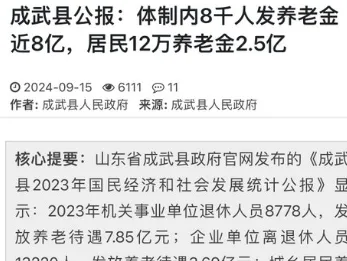 唐人日报8月12日讯:近日,一则来自山东省成武县的旧公告再次在网络流传,引发公众对养老金分配公平性的热烈讨论。根据成武县政府2024年发布的数据显示,2023年全年,该县体制内8778人的养老金支出接近8亿元,平均每人年领取金额高得惊人;而1.3万名离退休职工合计领取养老金3.69亿元。相比之下,剩余的12万名城乡居民养老保险领取人员全年仅分得2.51亿元,平均到个人手中,金额微薄到令人心寒。
