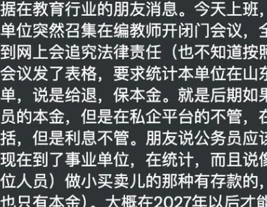 山东教育单位突召教师闭门会议!要求统计国企存款名单,称防破产“保障本金”
