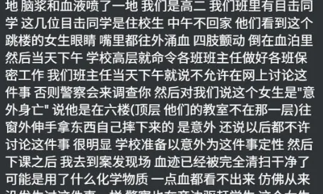 据校内学生私下透露,这名女生生前精神状态明显异常,曾多次因遭受同学排挤、辱骂而情绪崩溃。然而,在事件发生后,学校迅速封锁信息,不仅禁止学生讨论,还要求删除相关言论。据称,已有多名学生因在微信上谈论此事而接到警方电话警告。