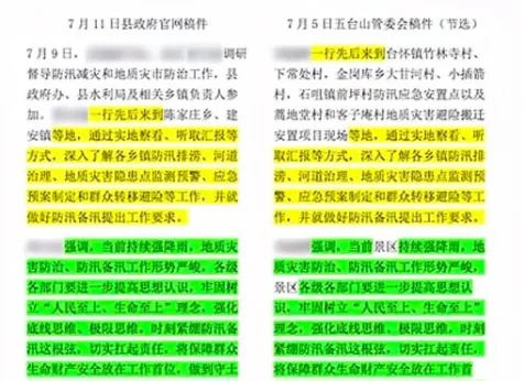 唐人日报7月28日讯:近日,有网友在浏览山西忻州市五台县政府网站时发现,一篇发表于7月9日、署名为五台县县长的调研通稿,与7月5日五台山景区党工委副书记发布的调研稿内容惊人相似。经比对,两篇文章全文约390字,其中高达320余字完全重复,引发大量网友质疑是否存在公文抄袭现象。