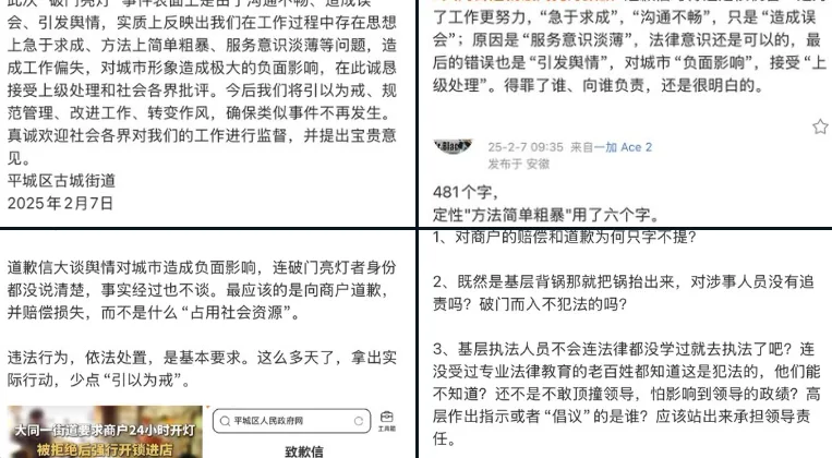 唐人日报2月8日讯:近日,山西大同市政府就“破门亮灯”事件发布致歉信,承认在执法过程中“思想上急于求成、方法上简单粗暴、服务意识淡薄”,并表示接受上级处理及社会批评。然而,该致歉信未提及对相关人员的处罚,也未向受影响商户正式道歉,引发公众强烈不满。