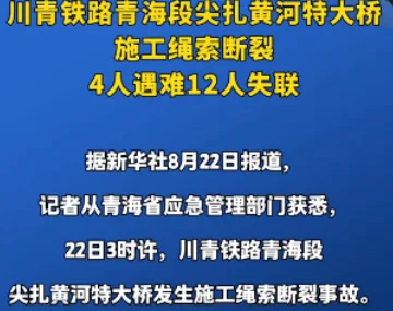 唐人日报8月22日讯:正在建设中的川青铁路尖扎黄河特大桥发生重大安全事故,施工现场一条关键绳索突然断裂,导致多人坠落。事故发生后,当地迅速组织紧急救援。截至当日上午8时,事故已造成4人遇难,12人失联。