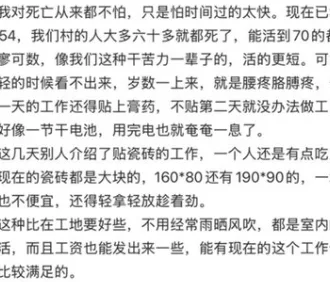 唐人日报10月9日讯:一位农民工在小红书上发布了一篇名为《等我60岁,也该歇歇了吧》的短文,引发上百万网友的关注与共鸣。文中没有抱怨,也没有愤怒,只有一句句平静到令人心酸的叙述:“我们村的人,大多六十多就死了。像我们这种干苦力一辈子的,活得更短。”