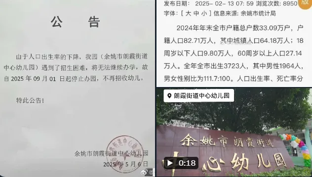 唐人日报5月14日讯:近日,浙江余姚朗霞中心幼儿园发布公告称将于今年9月1日起停止办园,原因直指“人口出生率持续下降,导致招生困难”。一句直白而冷峻的表述,将人口问题与教育行业的结构性危机直接挂钩,引发舆论关注。