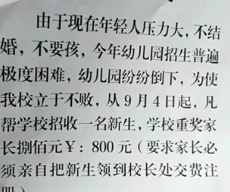 唐人日报8月22日讯:近日,一则陕西眉县双语幼儿园贴出的“重奖公告”引发热议。公告直言,由于当前年轻人普遍面临压力,不愿结婚生育,导致今年幼儿园招生“极度困难”,许多幼儿园面临倒闭困境。为维持生存,该园决定自9月4日起,凡是家长能介绍并带新生前来注册缴费的,将一次性奖励800元现金。