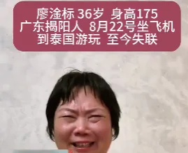 唐人日报9月4日讯:广东省揭阳市传出一则揪心消息。当地青年廖淦标在8月22日随友人乘飞机前往泰国旅游后,至今已失联多日。其母亲因音讯全无、心急如焚,无奈之下拍摄视频,向社会公众发出求助。