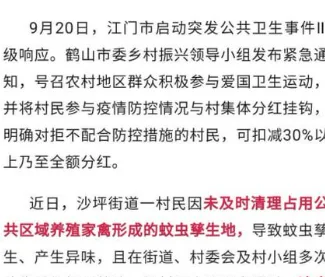 唐人日报10月10日讯:广东省江门市多地农村在推进“爱国卫生运动”过程中,推出了一项颇具争议的新规定——凡村民未按要求清理房前屋后杂物、鸡棚、菜地者,将被“村民会议”决定扣减年度村集体经济分红30%。这一做法引发舆论哗然,被质疑“以罚代管、权力滥用”。