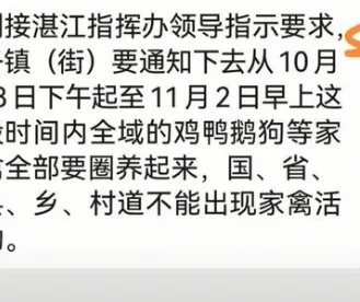 唐人日报10月29日讯:广东湛江多地居民收到通知,为迎接省人居环境整治督查组的检查,市指挥办下令自10月28日至11月2日,全域范围内鸡、鸭、鹅、狗等家禽家畜一律圈养,不得在国道、省道、县乡村道路上出现任何活禽。此举在社交平台上引发热议。