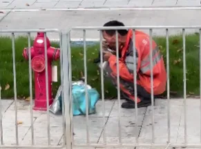拍摄者称,视频拍摄于中午十二点左右,气温高达三十五摄氏度。环卫工人肩上还搭着抹布,手里拿着一次性饭盒,默默地蹲在路牙石边吃饭,身旁是滚烫的柏油路和呼啸而过的车辆。他偶尔抬头四下张望,似乎在寻找阴凉或休息处,却始终没有离开路边。