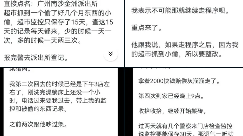 唐人日报2月3日讯:近日,广州一名超市老板发文讲述了超市被盗后的坎坷经历。老板称,2022年抓到小偷后,他到广州南沙金州派出所报案并要求走流程留案底,而不追求赔偿。然而,警方反问他与小偷是否有矛盾,并表示如果不和解,将需要对超市进行整改。