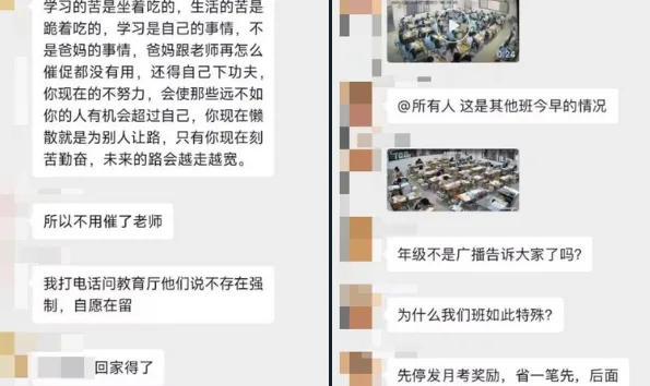 有教师透露,为了避免被追责,一些班主任不得不通过阴阳怪气的言语、电话家访等方式,逼迫学生“自愿”返校。“现在高三端午假期也被取消了,高一高二更是通过家长群发声,强迫孩子回来学习。”一名教师无奈地说。
