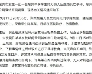 唐人日报9月29日讯:广西东兴市委、市政府调查组发布情况通报,对此前引发社会广泛关注的东兴中学学生持刀伤人并跳楼事件作出官方说明。通报指出,9月11日晚上8时36分,东兴中学一名许姓学生在晚自习期间持刀砍伤同班同学陈某后,迅速跑出教室并跳楼身亡。事件发生后,调查组第一时间介入,组织受伤学生的紧急救治,同时展开全面调查与善后工作。